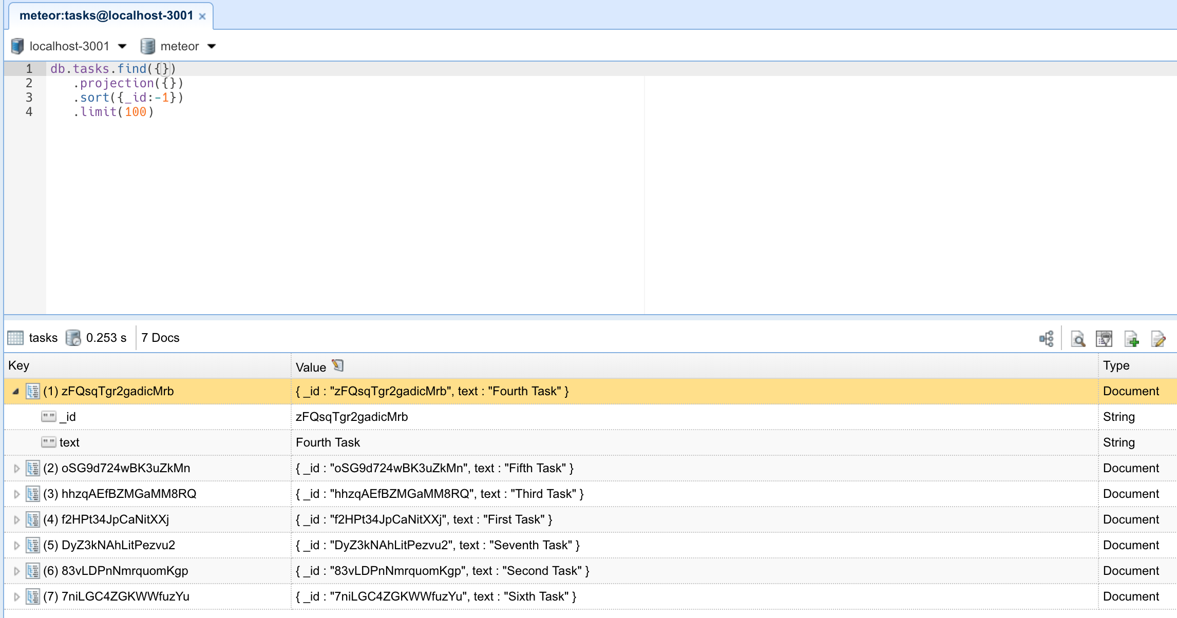 Meteor already sets up MongoDB for you. In order to use our database, we need to create a collection, which is where we will store our documents, in our case our tasks.